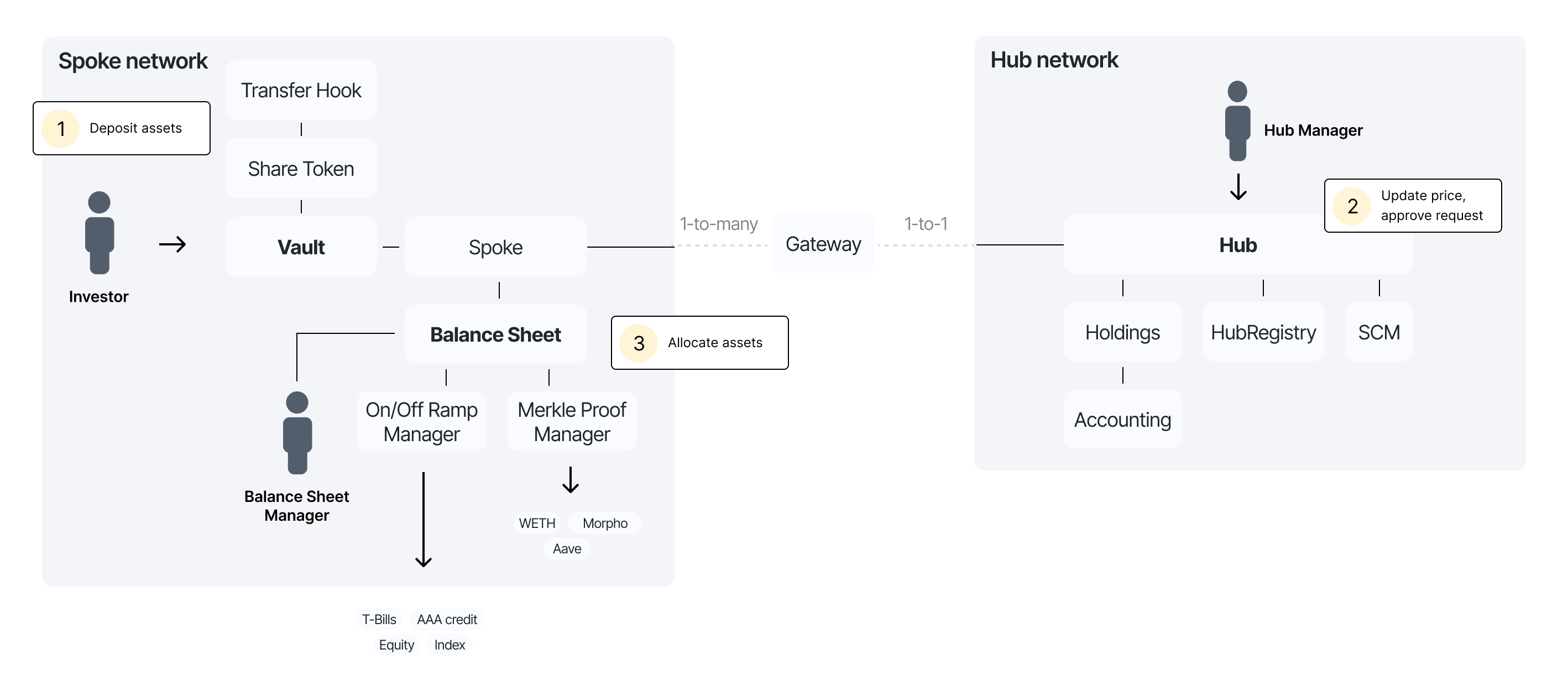 Centrifuge V3 operates on a hub-and-spoke model. Each pool chooses a single hub chain, and can tokenize and manage liquidity on many spoke chains.