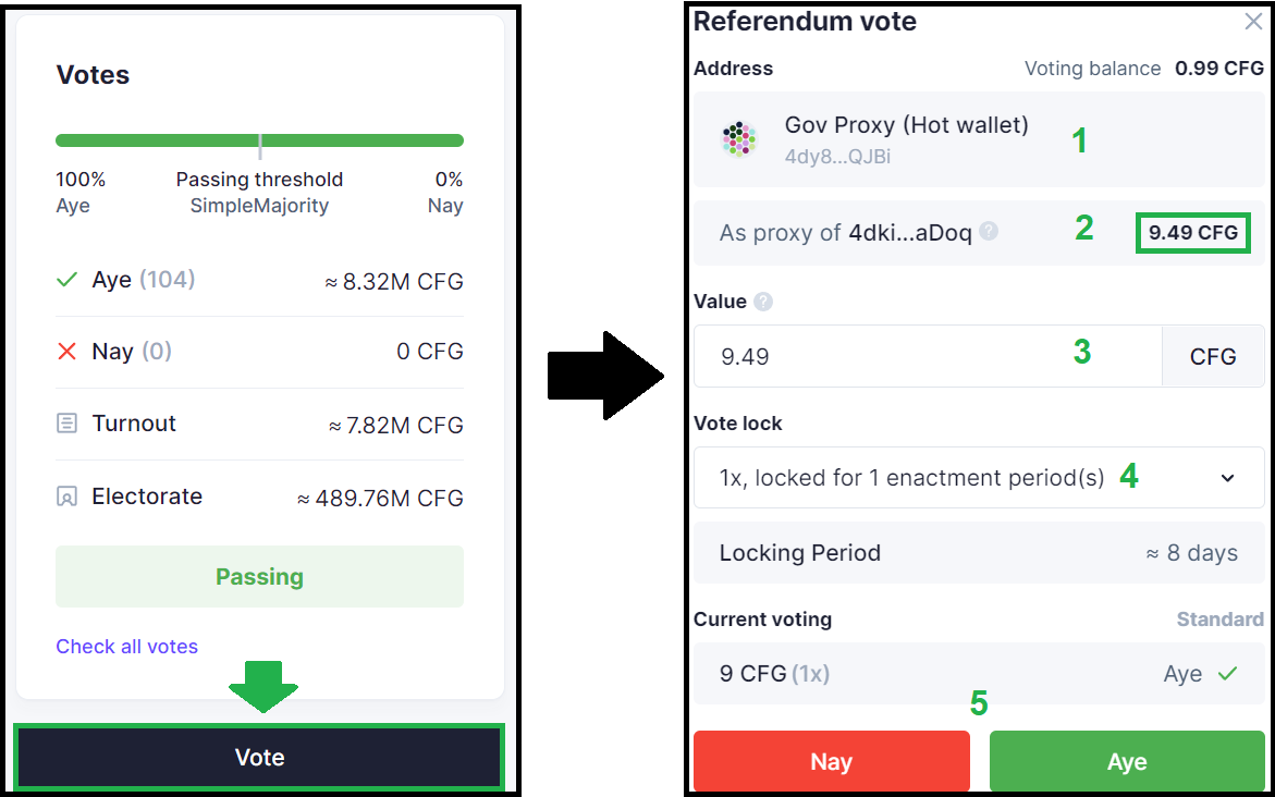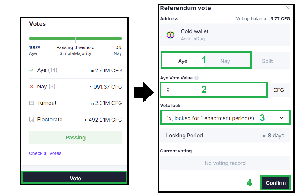 Onchain voting takes place on the blockchain and requires CFG tokens to vote in referenda. All proposals are posted in this section of the Forum. Here you will find all information you need about a proposal (what it is about, where to vote etc).