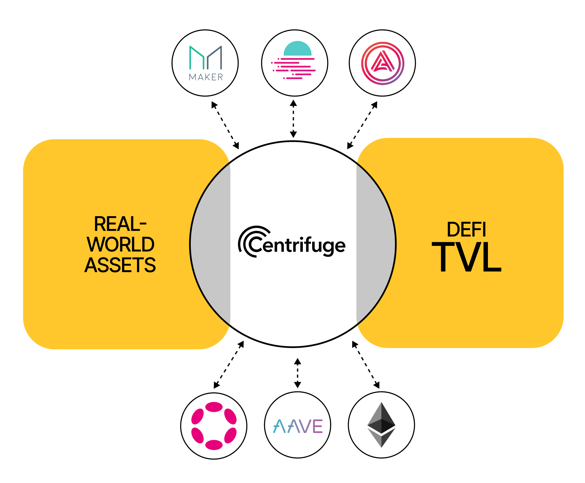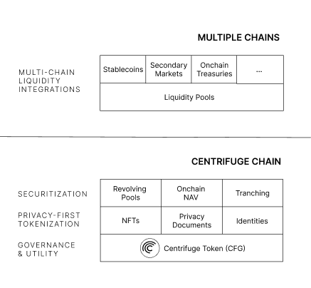 Centrifuge is built on Centrifuge Chain, a layer 1 blockchain custom built for financing real-world assets(RWAs). Real-world assets are tokenized as NFTs (Non-Fungible Tokens) to create an on-chain representation, and are linked to detailed off-chain data. The assets are pooled together and securitized by the issuer. Liquidity Pools can be used to invest from other blockchains. Integrations with DeFi protocols such as Maker, Aave, and more are already set up across the ecosystem.
