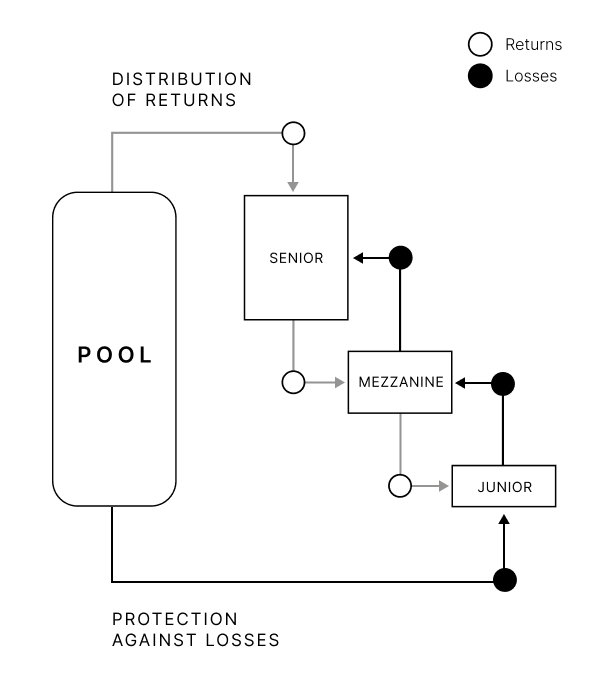 At its most common form, a pool can have a junior and senior tranche, with the junior tranche tracking the first loss position and receiving the excess yield, while the senior position receives a lower, fixed yield, but is protected from losses by junior. A key advantage of this structure is that it allows the issuer of the pool to invest in the junior tranche and thus take a first loss position in the pool, ensuring skin in the game.